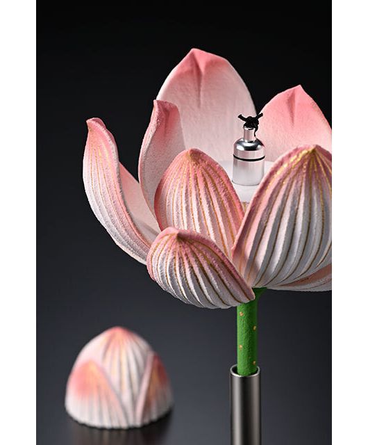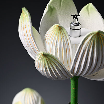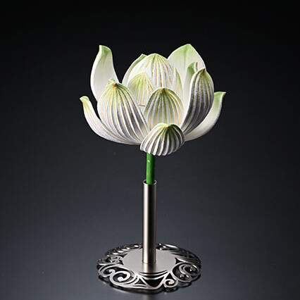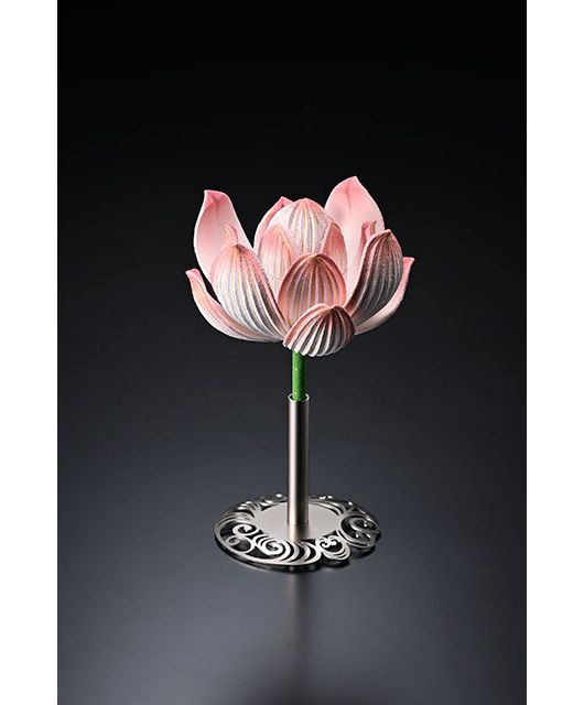 Wooden lotus flowers colored with natural mineral pigments. These are to be dedicated to the memory of the deceased. A small capsule that can hold the remains is placed inside the bud.