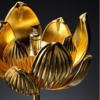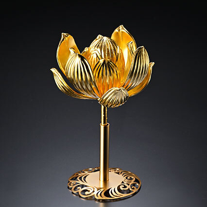 A gold-leafed wooden lotus flower to be dedicated to the memory of the deceased. A small capsule that can hold the remains is placed inside the bud.