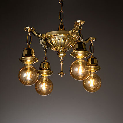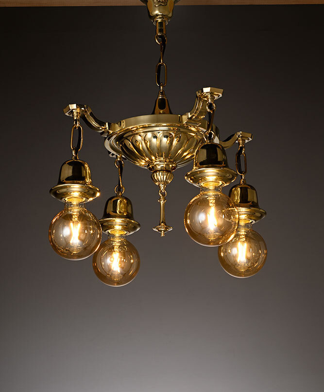 Brass ceiling light with an engraved chrysanthemum flower pattern. It gives a slightly retro and oriental atmosphere to the space.