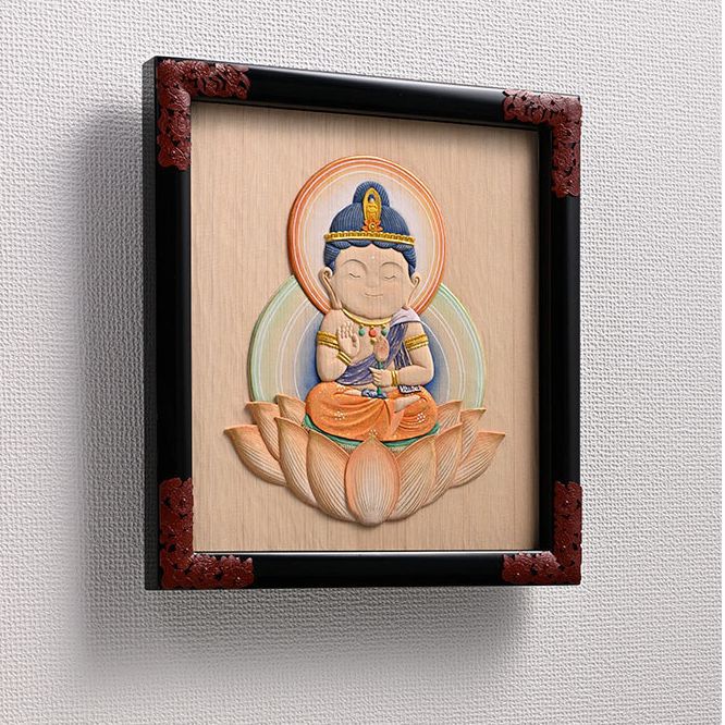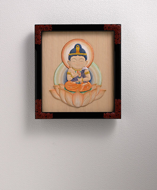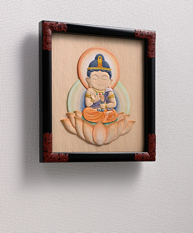 This relief of Kannon bodhisattva (Goddess of Mercy) evokes a sense of peace. Made of Japanese cypress wood, it is by the same artist as the Buddha relief displayed inside a Kyoto City Subway train.