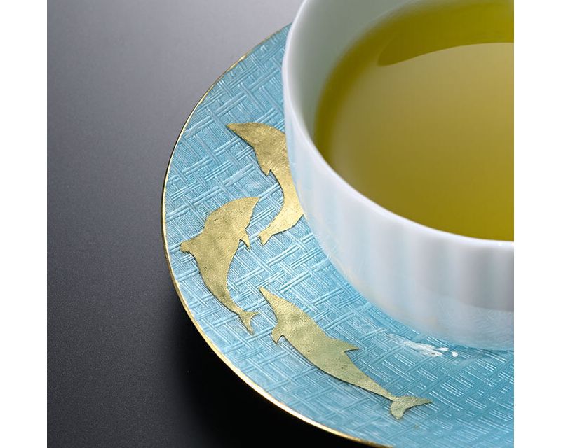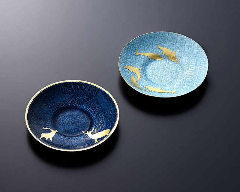 These brightly colored Kyoto-made shippo cloisonne saucer feature a dolphin and deer patterns in gold leaf.