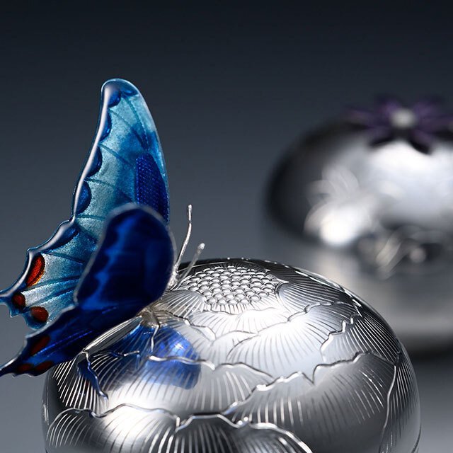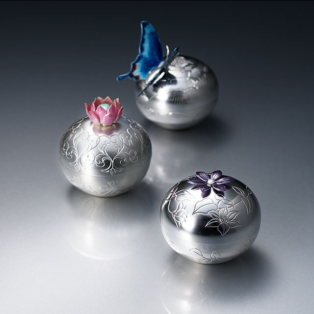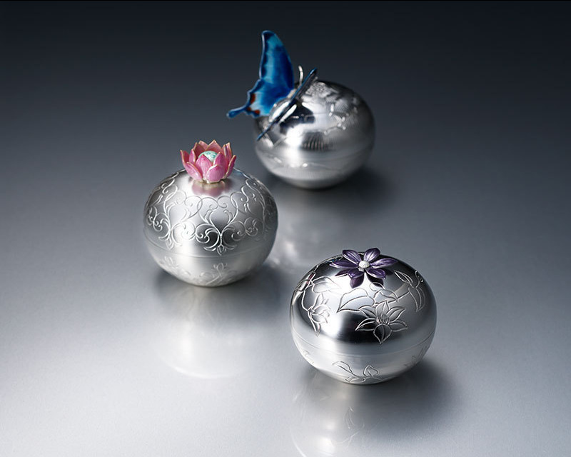 These sterling silver candy gift vessels are made with chasing and cloisonne techniques. Motifs such as cherry blossoms, lotus, and butterflies are used in the design.