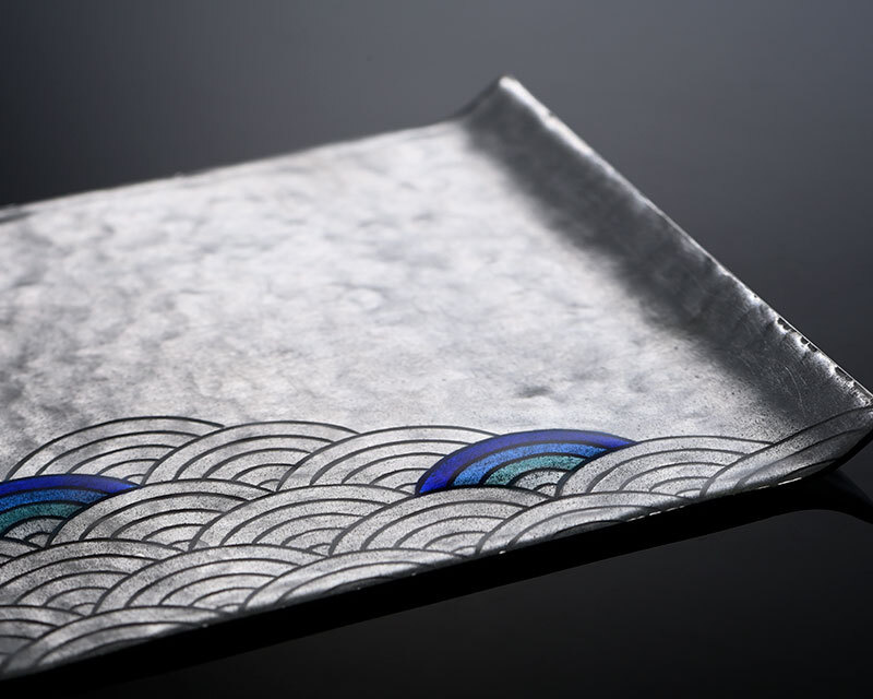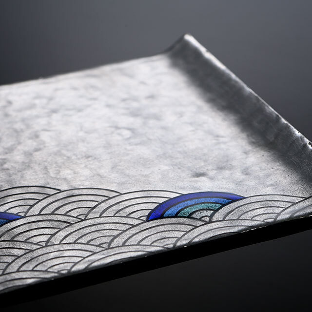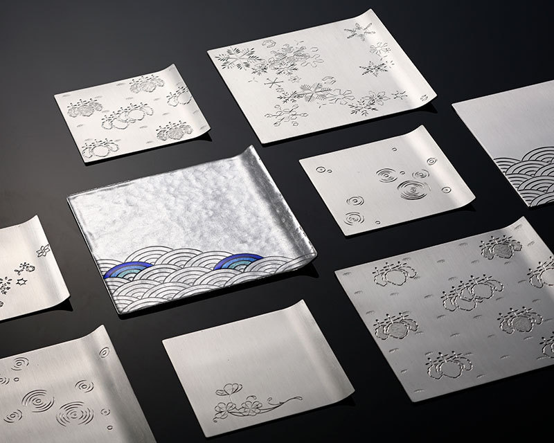 Small sterling silver plates engraved with four different patterns. Paulownia is a tree on which a phoenix stops to bring good omens, ripples represent prosperity from where they spread out, the endless calm blue ocean waves represent peace, snow represents purity and purification, and clover means good luck.