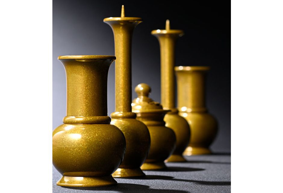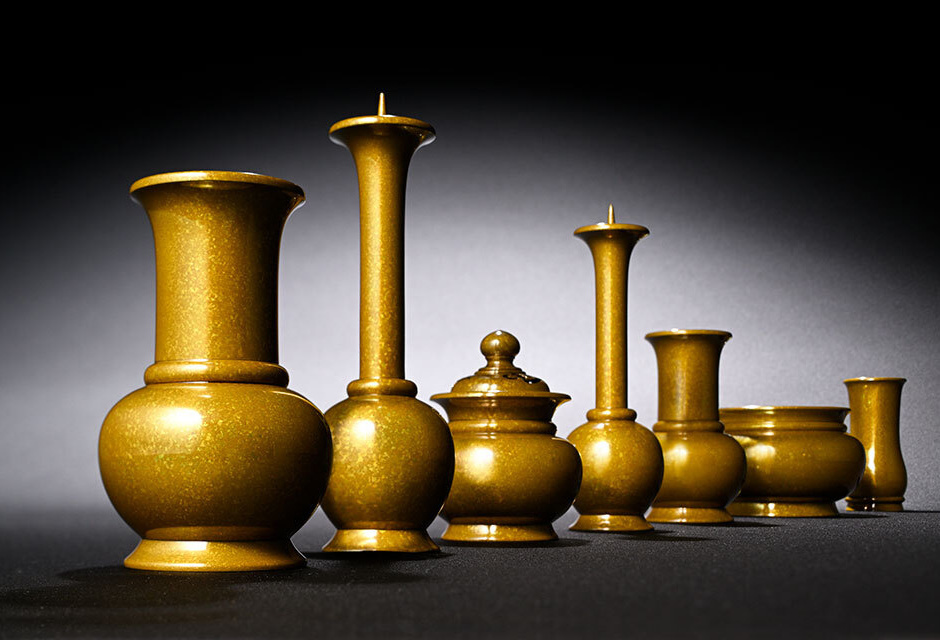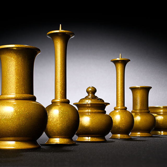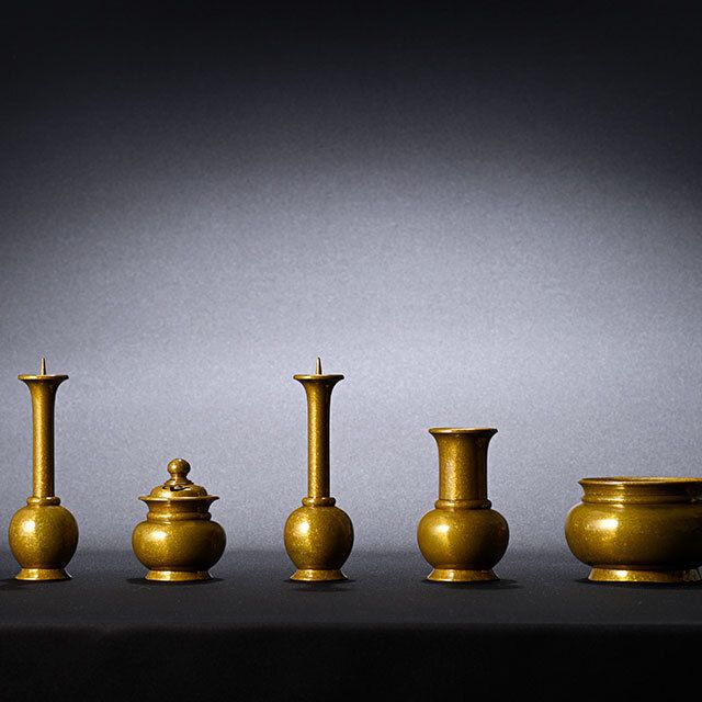 This seven-piece altar vessel set to be placed in front of a home altar includes two types of incense burners, an incense holder, a pair of vases, and a pair of candlestick stand. Made of yellow brass by craftsmen in Kyoto with advanced techniques, these articles emit an elegant luster.