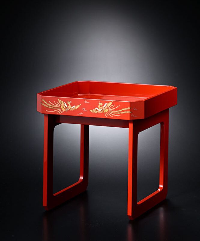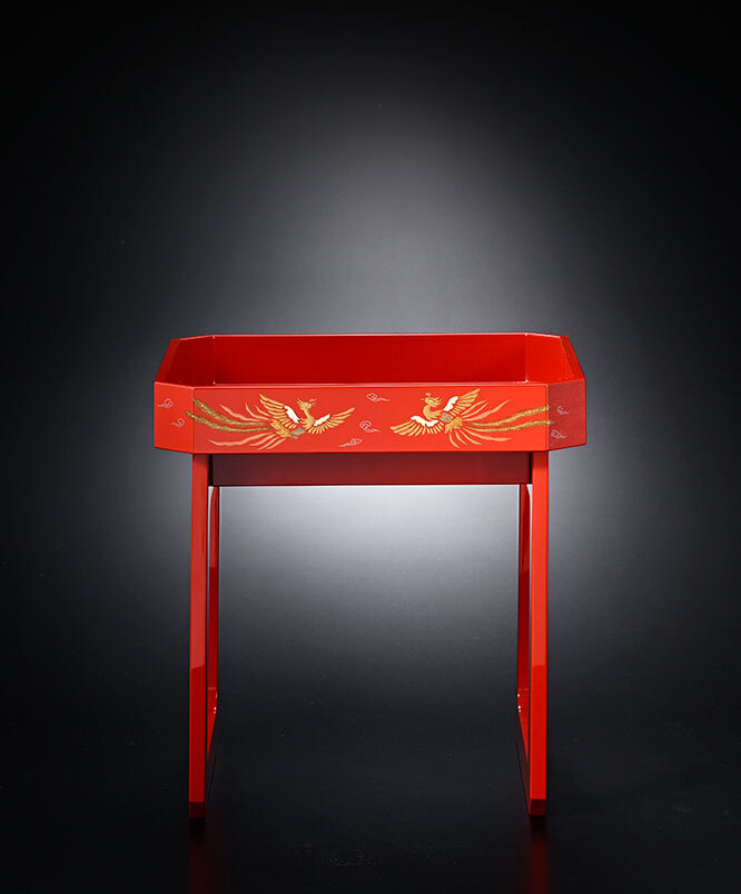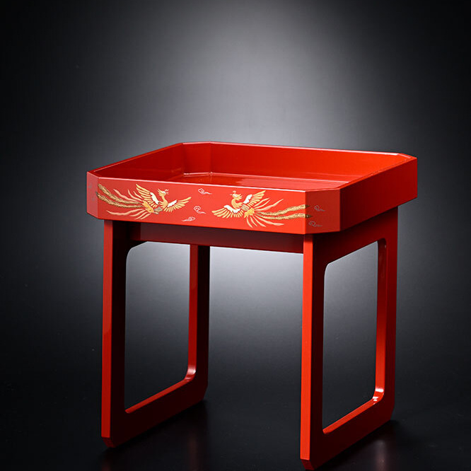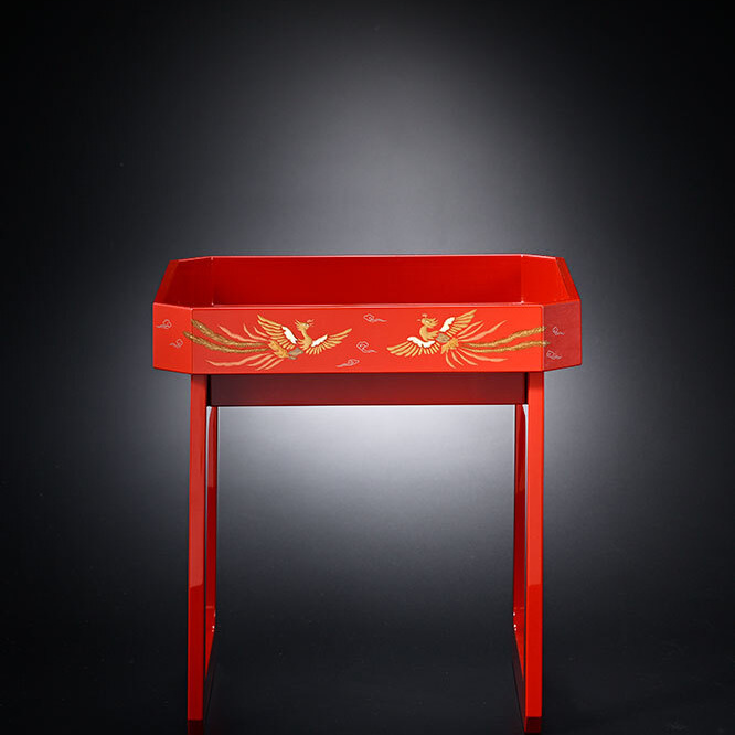 Hatsusunzen is an offering stand used in Zen temples. The front of this item features the sacred bird, the phoenix, on a bright vermilion lacquer, creating a festive atmosphere.