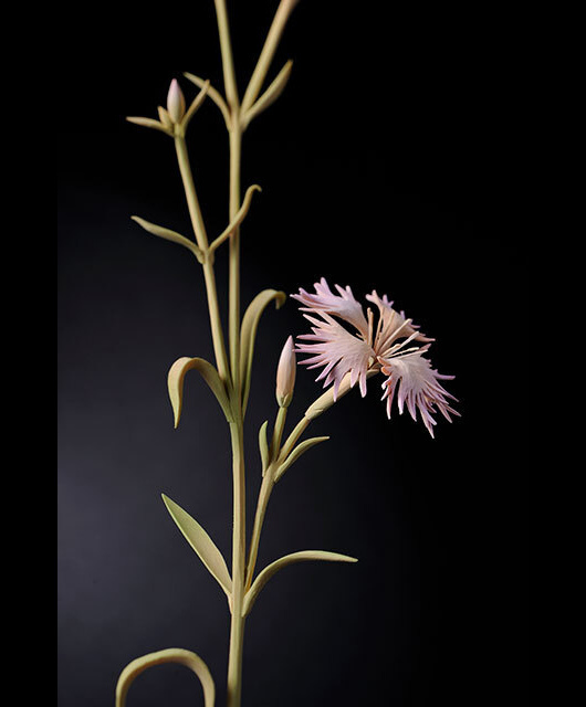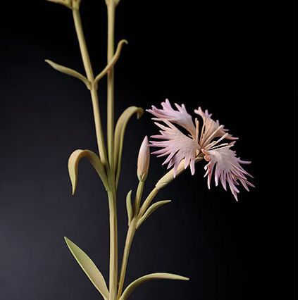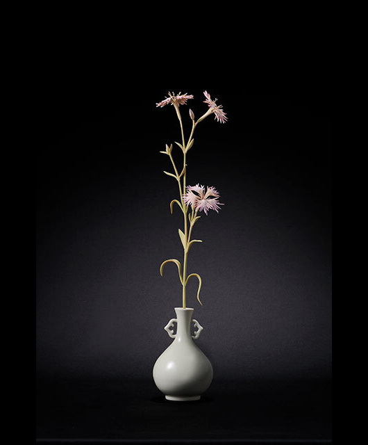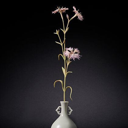 This delicate wood carving of a nadeshiko or fringed pink flower is made of cypress wood and finished with delicate colors. The vase is made of white porcelain.