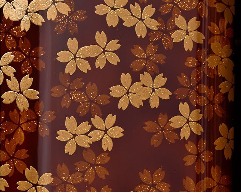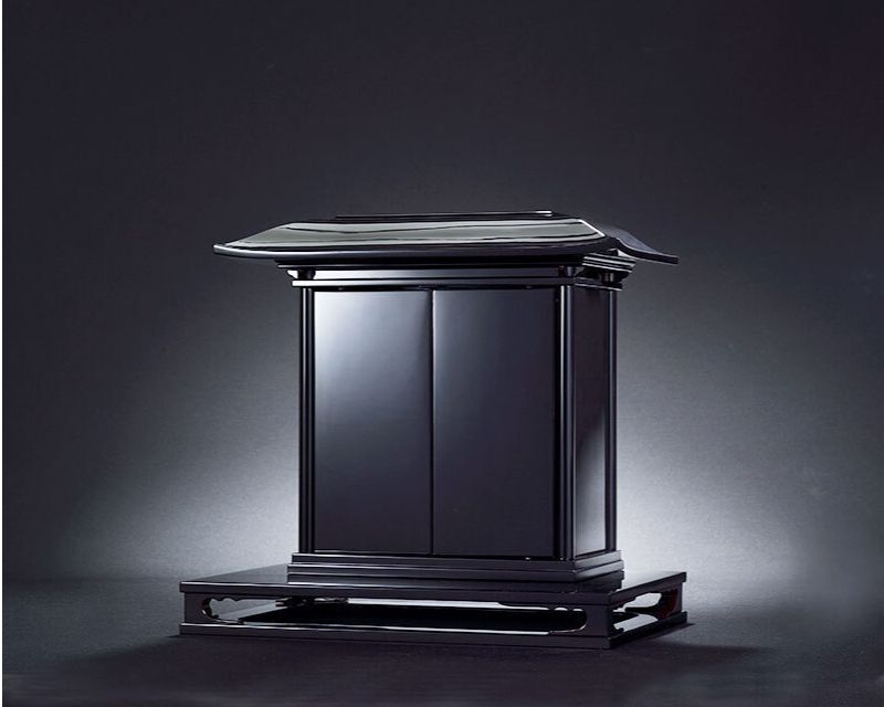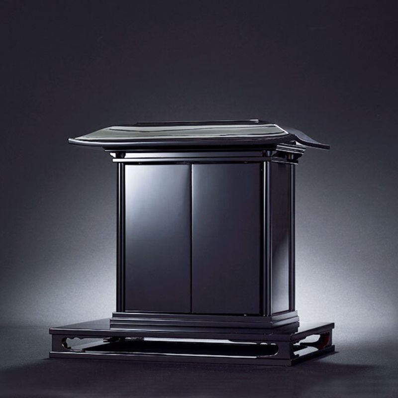 The doors of this deep black–lacquered small altar use the maki-e technique to express the depth of the scattered cherry blossoms. The doors are constructed to open by pushing on the outer part.
