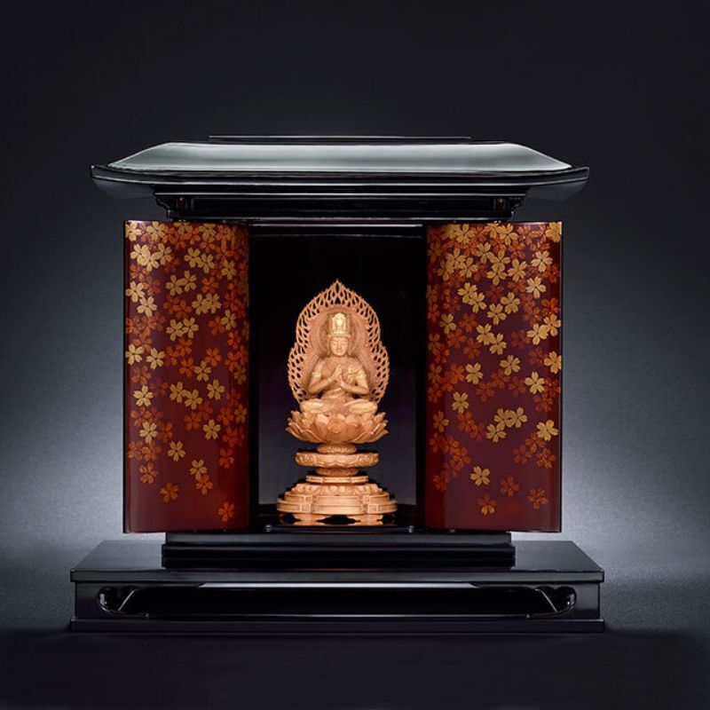 Roiro urushi-lacquered zushi altar with cherry blossom maki-e-decorated doors