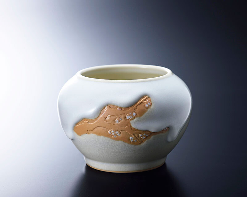 A plum tree stretches its branches in the falling snow, releasing a faint fragrance. This scene was expressed by carving plum tree branches into the base and applying a thick layer of glaze to resemble snow.
