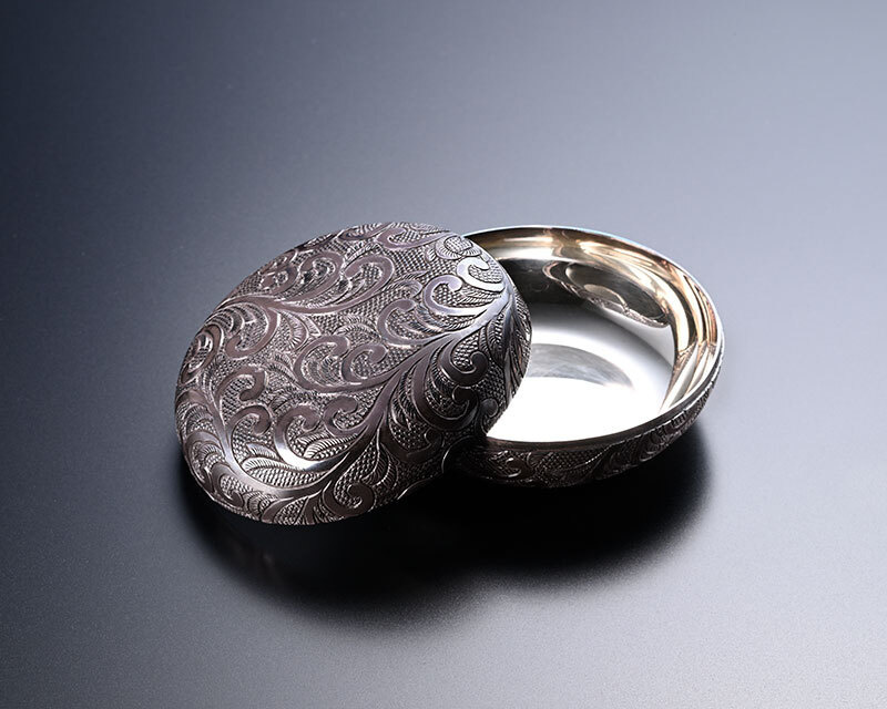 南鐐唐草彫香合 美しい上質の銀は南鐐とも呼ばれます。上質の銀に唐草文様を彫り込んだコンパクトな香合。手仕事ならではの繊細な彫金が施されています。 サイズ:W5.3×D5.3×H2.8cm材質:純銀仕様:彫金