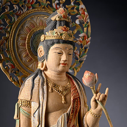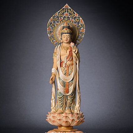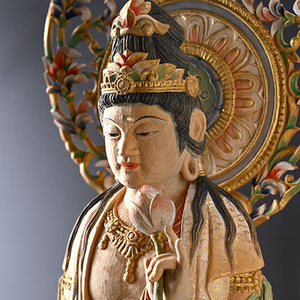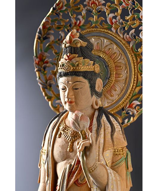 聖観世音菩薩 宗琳佛 観世音菩薩は、時の流れとともに姿を変化されております。元の観音という意味で聖観音(正観音)と呼ばれることもあります。仏師 松久宗琳氏 作 サイズ:W38×D15×H15cm (光背、台座含む)材質:桧仕様:淡彩色